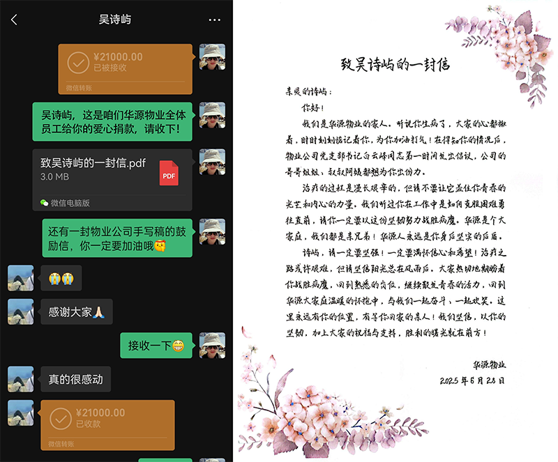 本次爱心接力共筹集善款21000元,每一笔捐款都承载着同事们的殷切祈愿。目前,所有善款已通过最快捷的方式转交吴诗屿家人,全力保障其后续治疗。吴诗屿家人收到爱心捐款,深情表达心声:“感谢华源大家庭的领导同事们!你们的善举如同雪中送炭,让我们在至暗时刻看到了希望的光。华源集团大家庭的温暖与力量,是我们坚持下去的最大勇气。千言万语,唯有感恩!”