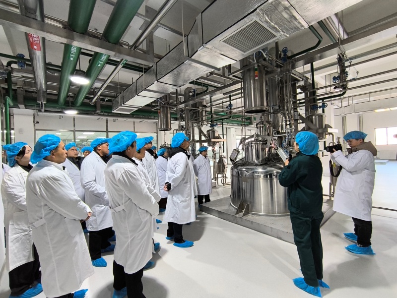 随后,嘉宾团一行前往银朵兰药业中药民族药产业园,实地考察中药民族药智能化生产现场。新药厂按照国家绿色工厂建设标准进行工业建筑设计,工业建筑节能标准达到75%,并将HY-C97高性能铝复合窗应用在产业园项目。建筑节能与设备节能相结合,应用太阳能与建筑一体化光伏发电技术、空气能多级蒸发冷空调技术、热泵技术回收燃气锅炉烟气和工艺循环水余热等技术,实现对能源分配、转换和消耗的全过程可视化动态管理,年减少用电3258万度,减少CO₂排放2.22万吨,节水2.09万吨。新药厂联合厂房内,从药材前处理的清洗、切制,到提取、浓缩、收膏的核心工序,已实现全流程自动化运转。依托DCS智能控制系统,药材加水量、煎煮时长、提取温度等关键工艺参数均能精准调控,每一项操作数据实时同步至中控平台,实现生产过程的可视化追溯。车间内200多台(套)生产设备通过系统联动实现“一键操作”,大幅提升了中药民族药生产的效率与安全性。新药厂年处理中药提取物10000吨,可生产颗粒剂10亿袋、片剂10亿片。规模化生产能力与智能化技术相结合,保障药品供应,推动中药民族药走向更广阔的市场。考察过程中,嘉宾团成员不时与技术人员展开交流,了解生产工艺、节能技术等关键技术,对银朵兰药业在中药民族药智能化、绿色化发展上的探索和成效给予高度评价。