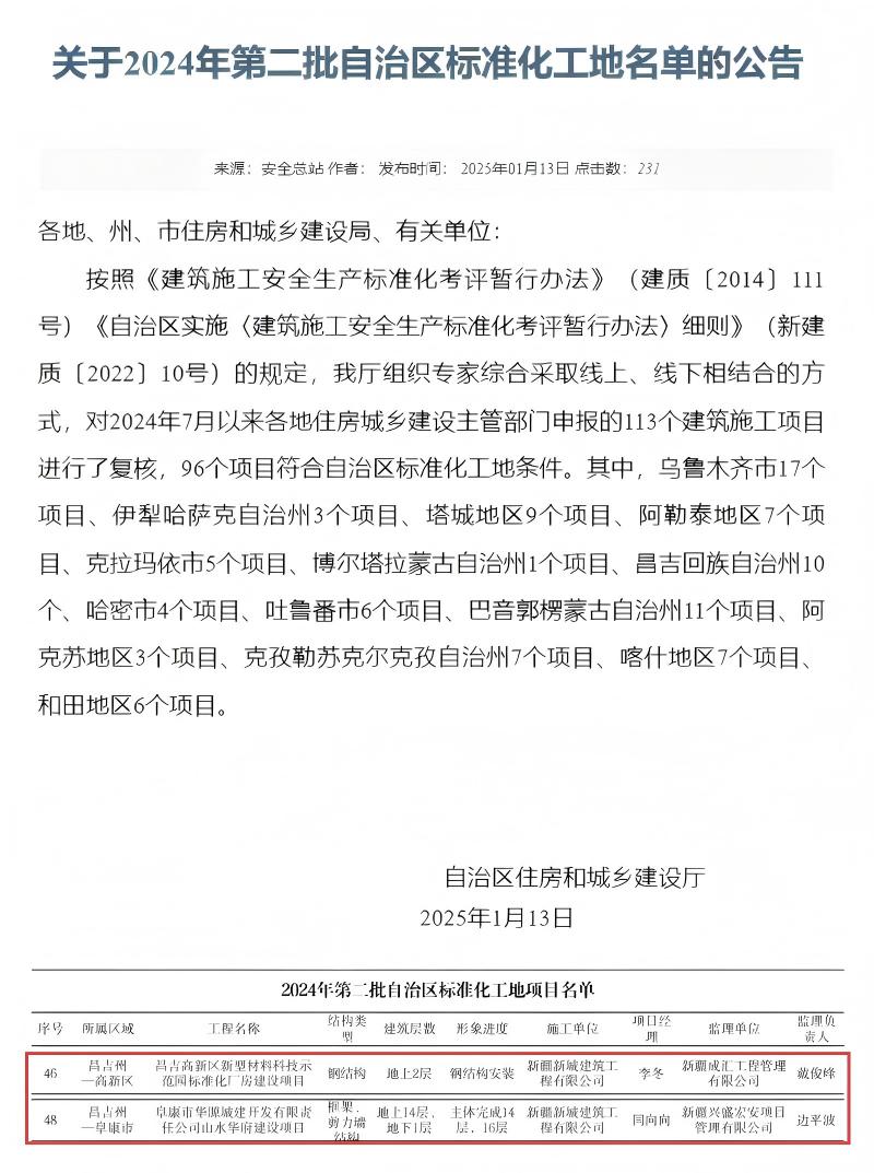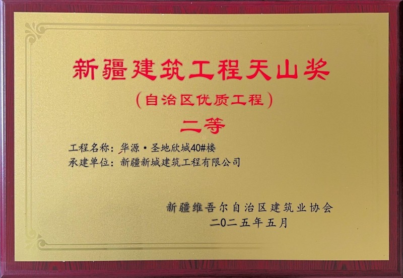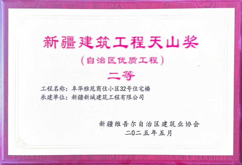 捷报频传,荣誉纷至!2025年,新城建筑公司以对卓越品质的执着坚守与精益求精的工匠精神,在全疆多地屡创佳绩,一批标志性工程脱颖而出,成为行业标杆。山水华府建设项目、昌吉高新区新型材料科技示范园标准化厂房建设项目成功获评“自治区标准化工地”;华源·圣地欣城59#、40#楼及阜华雅苑商住小区32号住宅楼项目荣获“新疆建筑工程天山奖(二等)”,以扎实过硬的工程品质赢得权威认可。