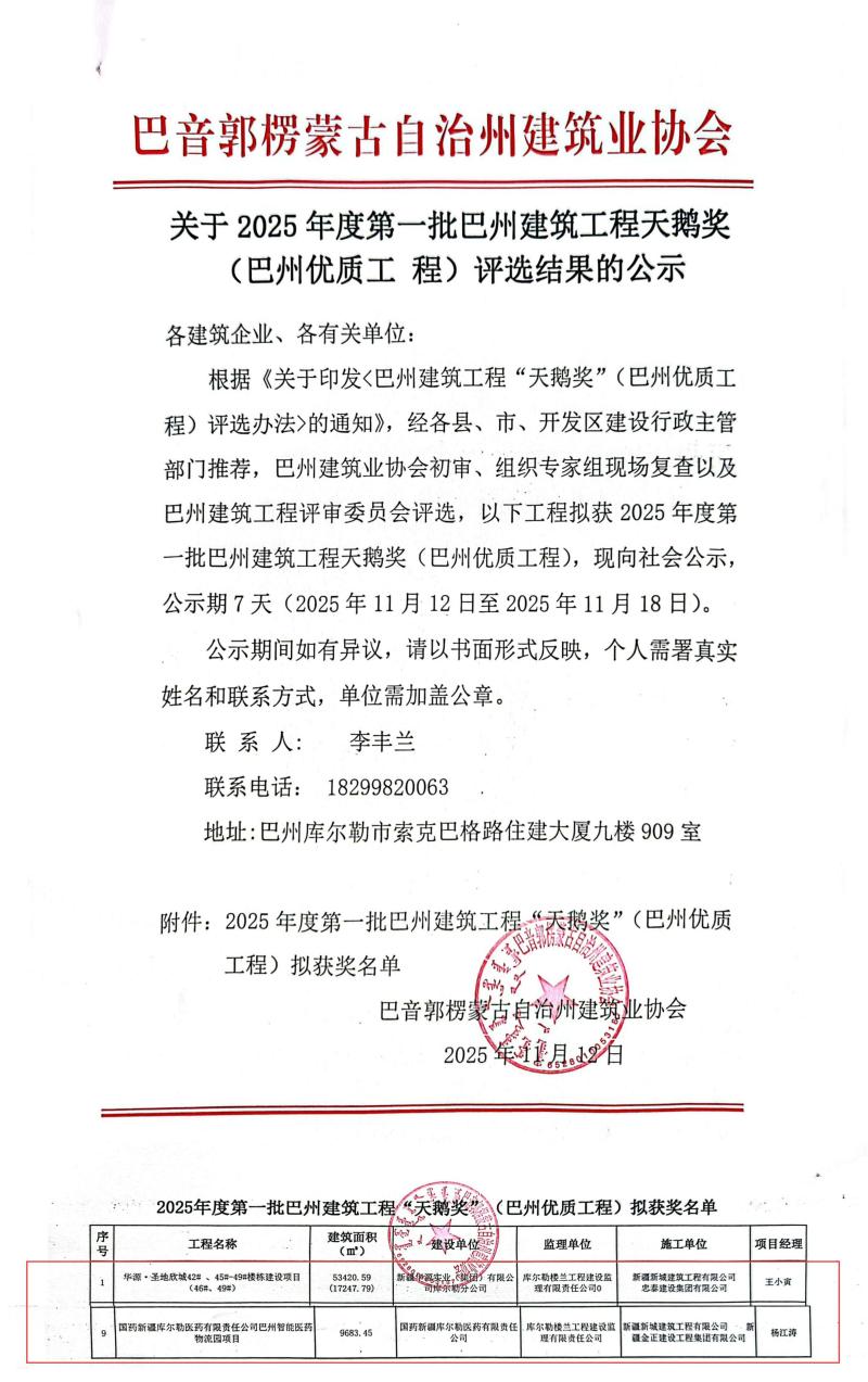 在技术前沿领域,华源·阜华雅苑商住小区(北地块)入选“自治区建筑业新技术应用成果典型案例”,充分彰显了公司强劲的科技创新能力。区域标杆工程同样硕果累累,华源·尚源家园小区7#住宅楼荣获乌鲁木齐市第二十九届“亚心杯”奖;华源·圣地欣城46#、49#楼及国药新疆库尔勒巴州智能医药物流园项目,则成功斩获2025年第一批巴州建筑工程“天鹅奖”;喀什经济开发区标准化厂房及配套设施建设项目荣获2025年度喀什地区“徕宁杯”专业奖项。这些遍布天山南北的精品工程,见证了公司以实干实绩推动高质量发展所取得的卓越成果。